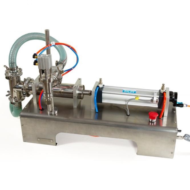 Semiautomatisk væskepåfyldningsmaskine fra Sammipack, pneumatisk styring, intern kernestruktur med høj præcision stempel- og trevejsventilsystem, der muliggør hurtig, kontrollerbar og nøjagtig væskepåfyldning.